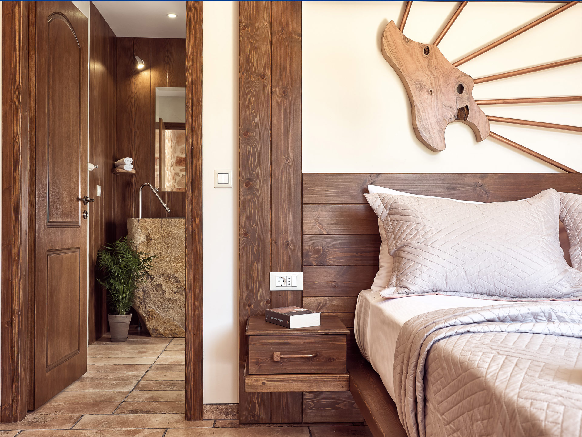 Accessed from the dining area on the ground level of the Villa is a master bedroom one can dream of while on holidays. In the centre of a spacious room is a queen size bed, designed to complement the architecture of Meralia. En-suite bathroom with corner jacuzzi tub, shower and hand made olive wooden sink is a perfect place to retreat to after the sun baths. In the morning you can enjoy a strong coffee or a glass of fresh orange juice on the sofa just outside of the room on the veranda.